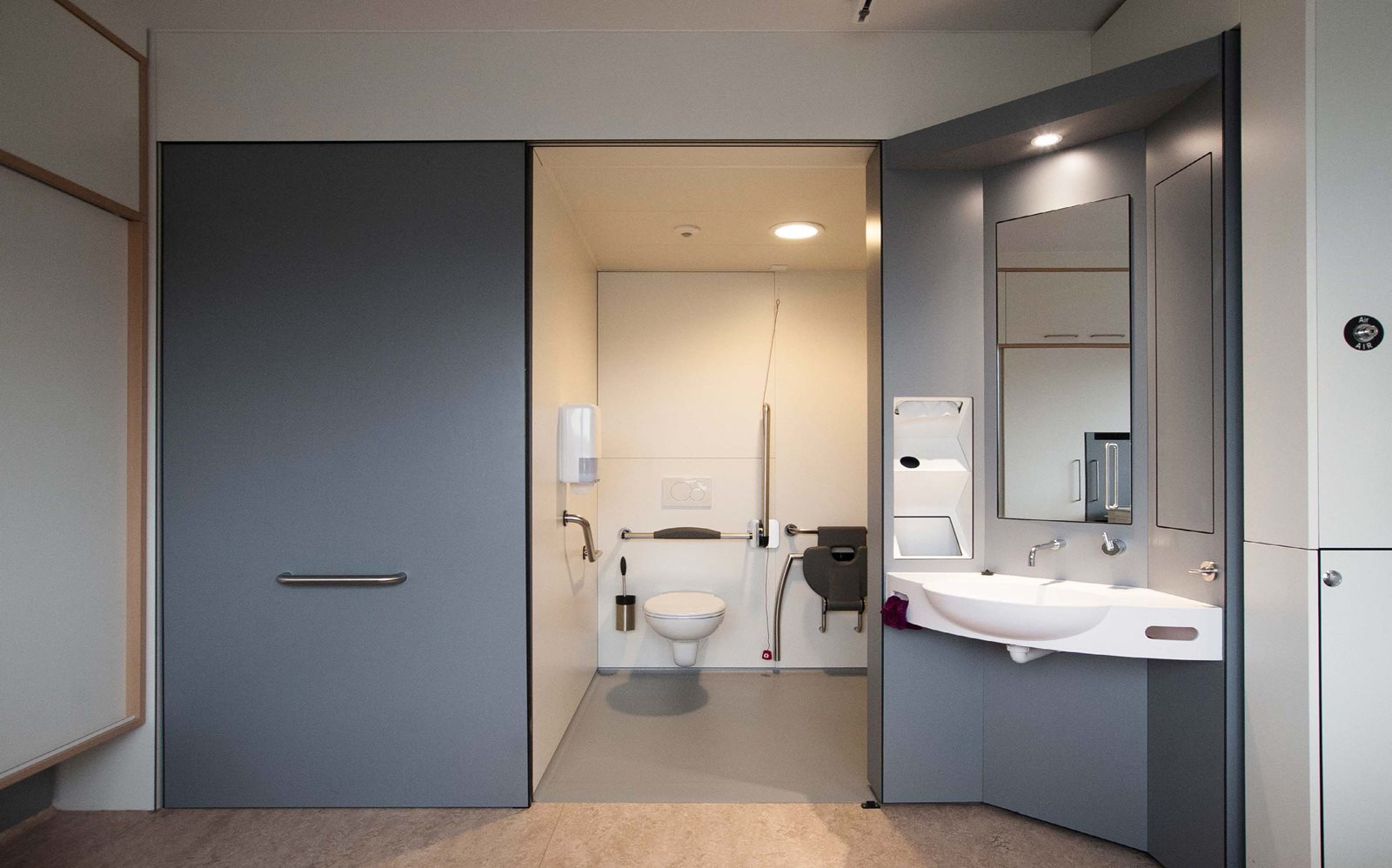 Le choix de l'architecte en charge du projet, Frédéric Francotte, s'est porté sur une cabine sanitaire adaptative qui offre au patient les différentes fonctions nécessaires: un lavabo sur pivot facilitant l’accès à la douche et au WC PMR.
