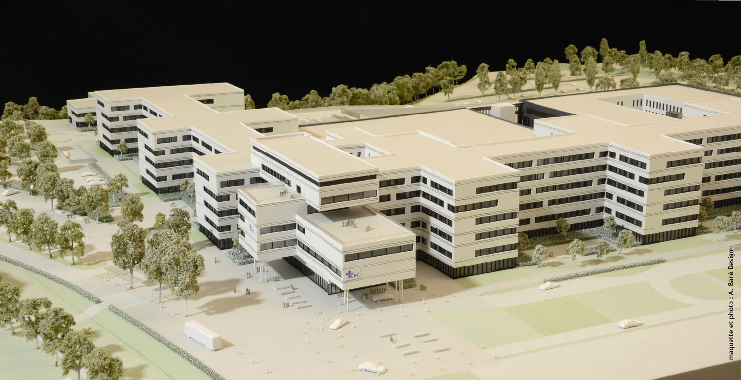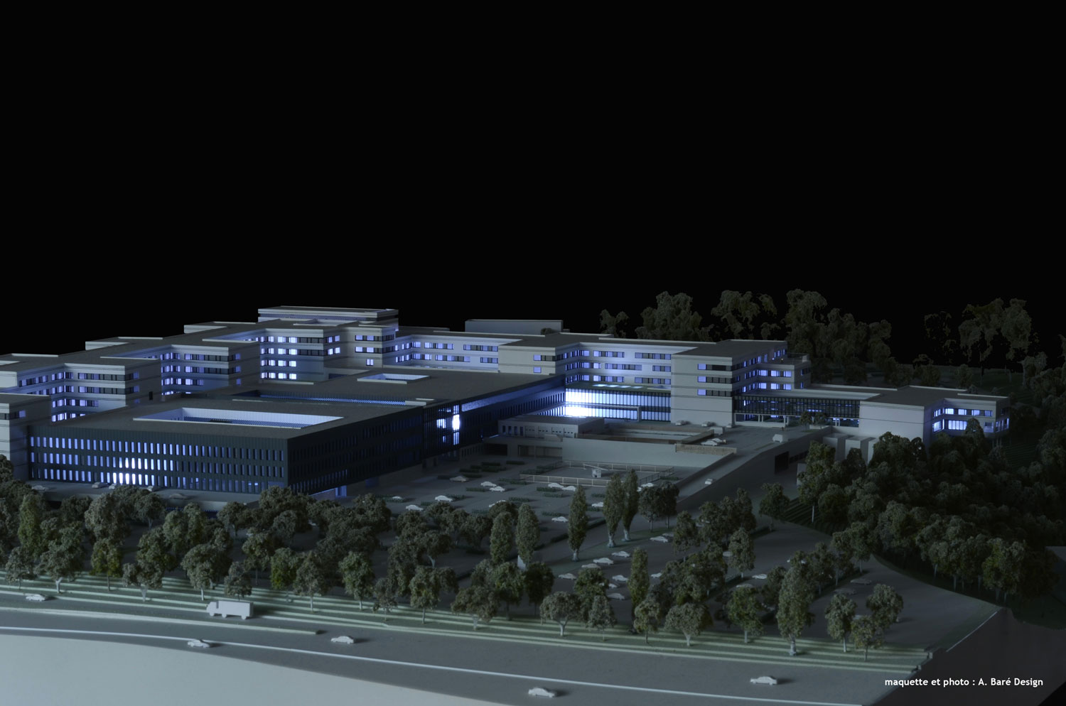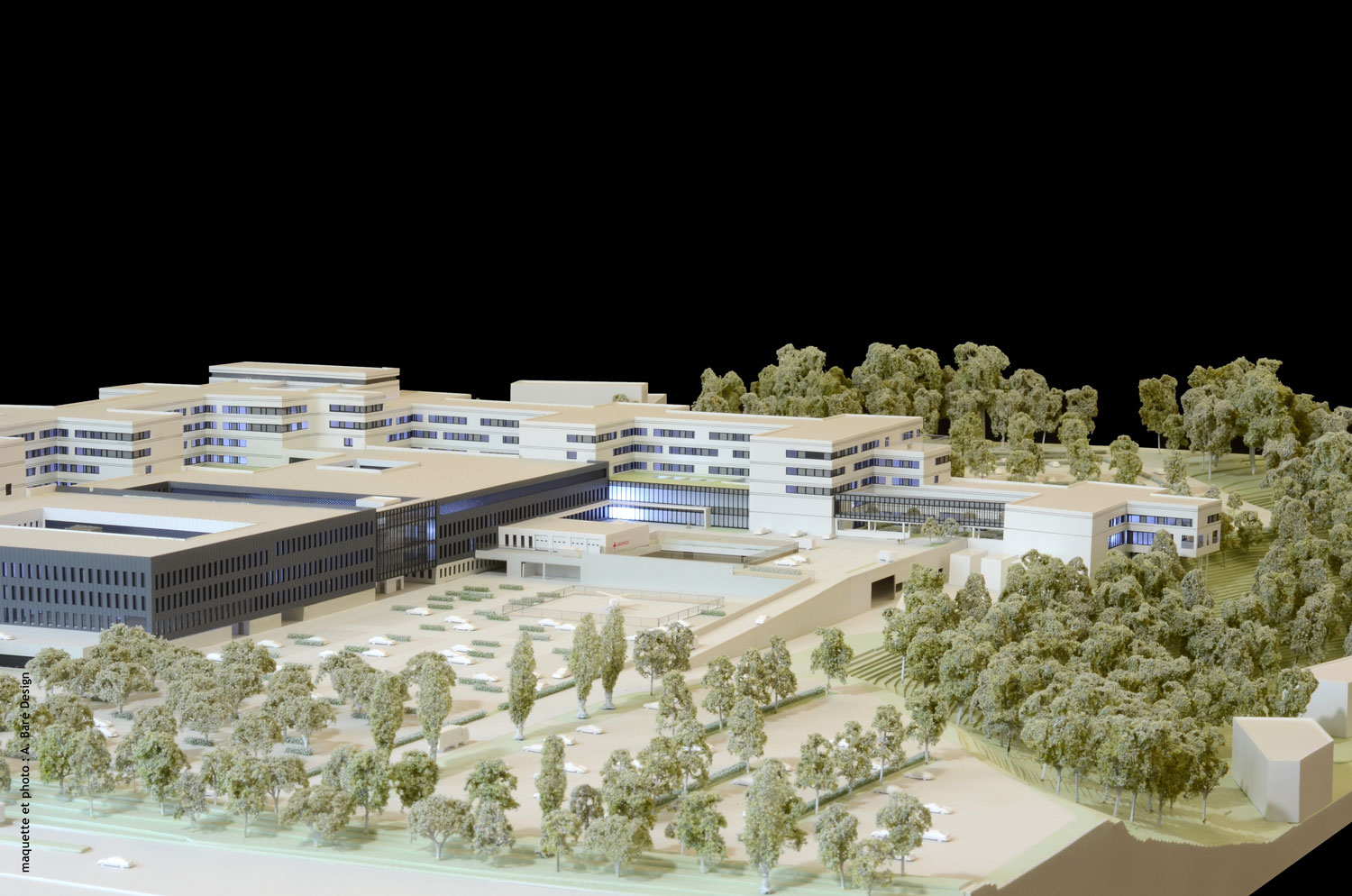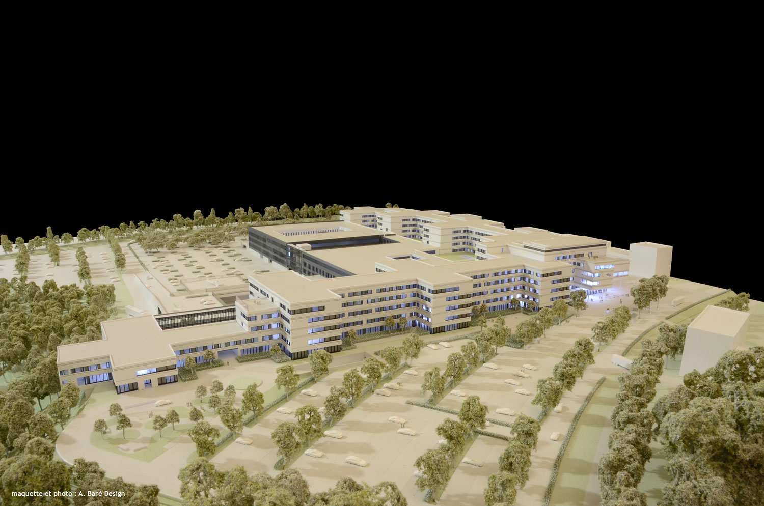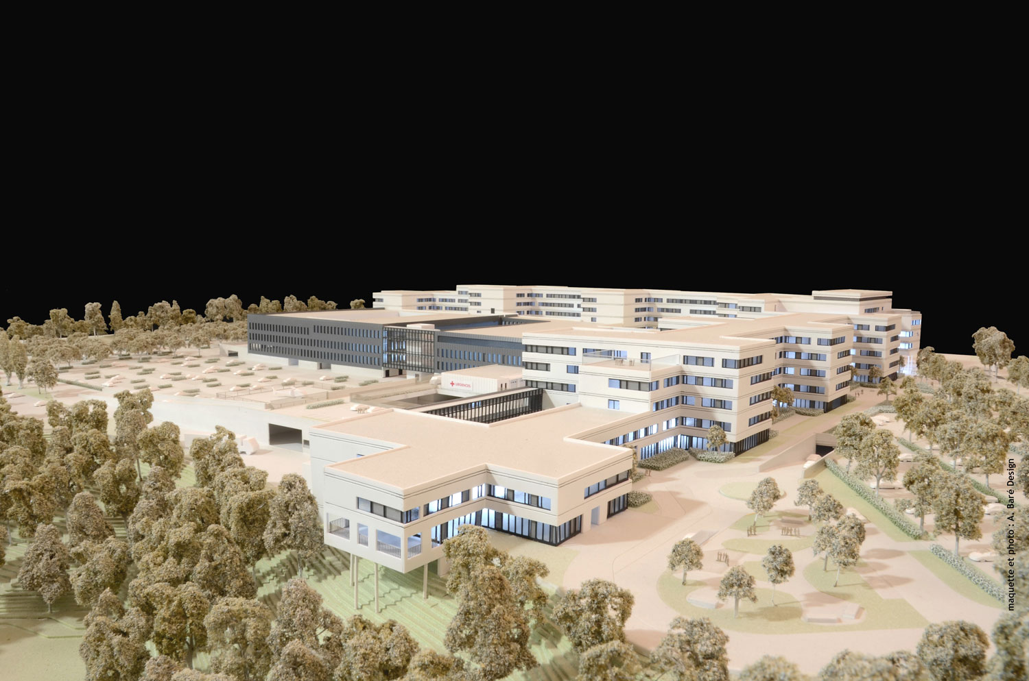 Réalisée par A. Baré Design, la maquette donne une idée très concrète des dimensions de l’ensemble mais également de l’agencement des bâtiments entre eux, ainsi que de la manière dont la clinique s’intégrera dans son cadre général. Les abords apparaissent également de façon plus précise: circulation autour du bâtiment, espaces verts, parkings arborés.