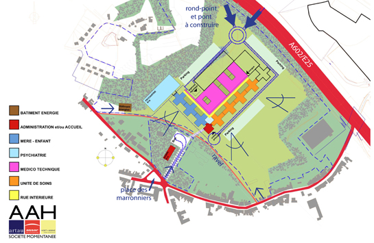 Les illustrations qui constituent l'esquisse représentent le bâtiment principal d'un point de vue général, c'est-à-dire sans donner précisément l'aspect réel extérieur du futur hôpital (courbes éventuelles, matériaux, couleurs...). Les gestes architecturaux, esthétiques et urbanistiques, de même que l'agencement des locaux, seront affinés au stade de l'avant-projet, dans un second temps.