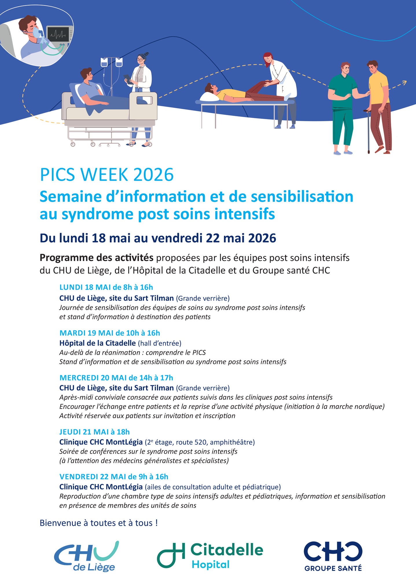 Du lundi 18 mai au vendredi 22 mai 2026. Activités proposées par les équipes post soins intensifs du CHU de Liège, de l’Hôpital de la Citadelle et du Groupe santé CHC