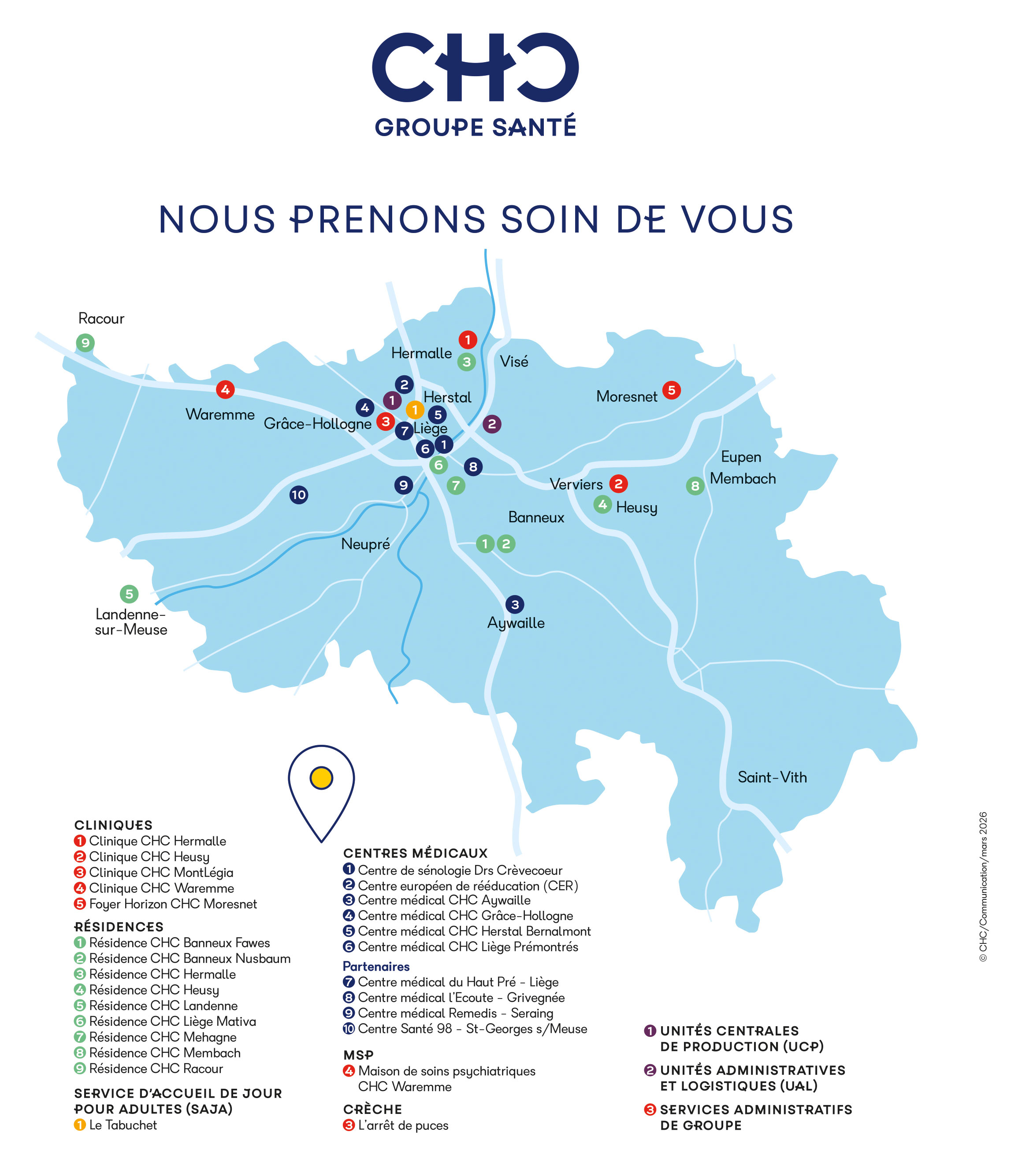 Le Groupe santé CHC est un acteur incontournable du paysage des soins de santé de la province de Liège. Nous accueillons majoritairement des patients et des résidents issus de la périphérie liégeoise, mais également, de plus en plus, grâce à la diversité de notre offre et de nos partenariats, une patientèle plus éloignée géographiquement.