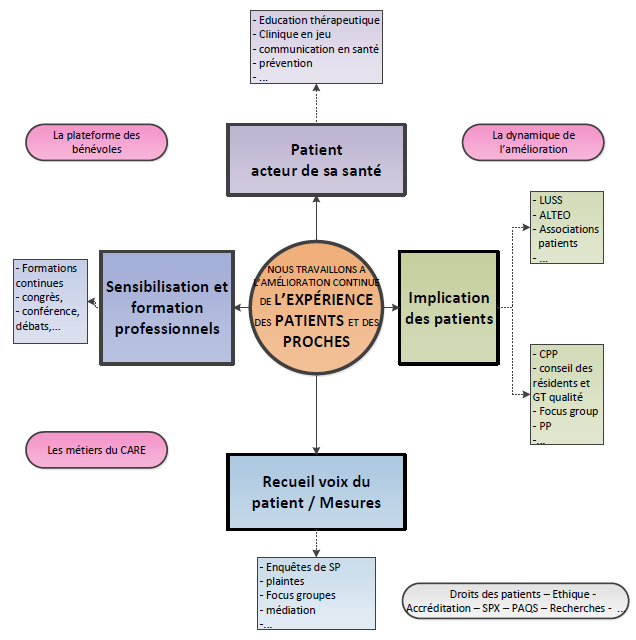 - Impliquer les patients (ou leurs représentants) dans la vie de l’hôpital, au travers d’organes comme le comité de participation des patients (à hôpital), le conseil des résidents (en maisons de repos), différents groupes de travail (ex: itinéraires cliniques), et au travers de ses contacts avec les associations de patients (LUSS, Alteo...).