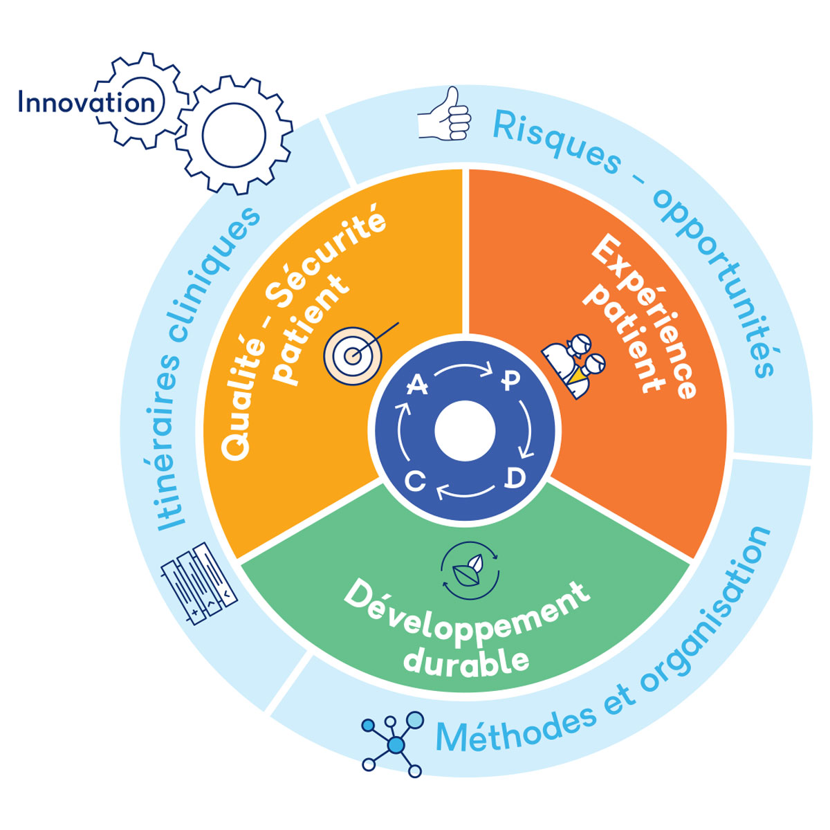 L’amélioration continue vise à répondre aux évolutions toujours plus rapides, qu’elles soient internes ou externes, pour garder un coup d’avance. La démarche s’envisage de manière transversale: tous les métiers, toutes les entités. Elle vise les risques et opportunités, mais également la satisfaction des patients/résidents et celle des collaborateurs.